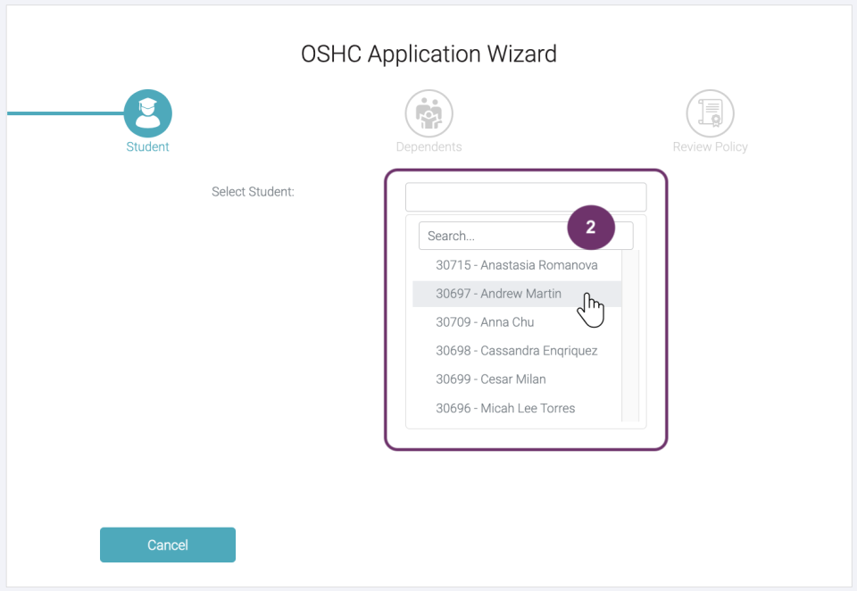 Click the box to see the list of students linked to you. Click the student name whom the policy belongs to. If the list is too long, you can just type the name in the Search box above the student list.