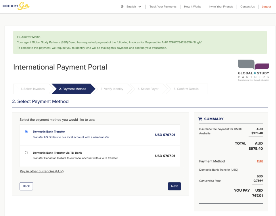 20. Click ‘Pay Now’ button to be redirected to the payment portal for international studies called, Cohort Go Payments. It should look like the image below: