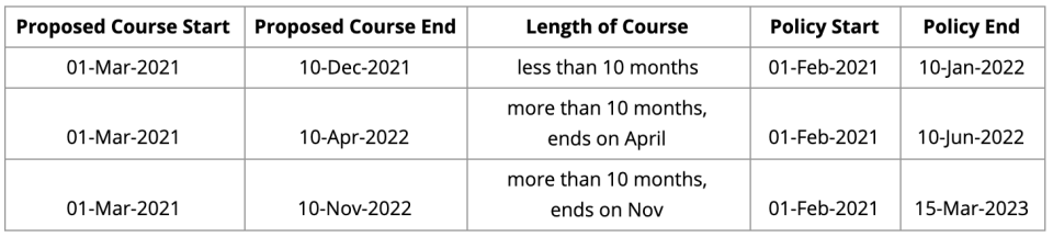 There are some rules on how the policy starts and policy ends is being computed. Please refer to the table and some examples below