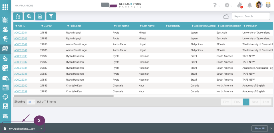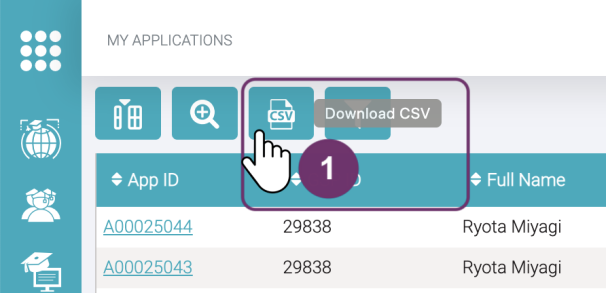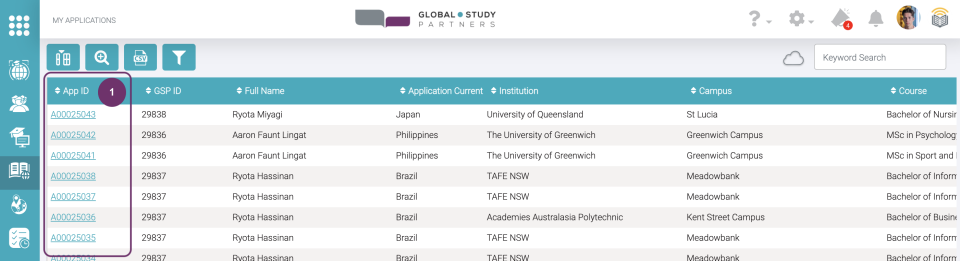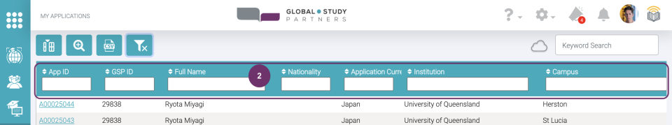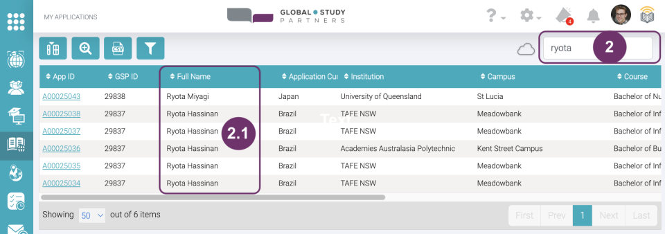 Example 1: You are looking for applications of a student named ‘Ryota Hassanan’. When you type ‘Ryota’, the function will search any part of the details bulleted in #1 and will display the following possible results based on the record of students you are allowed to access: