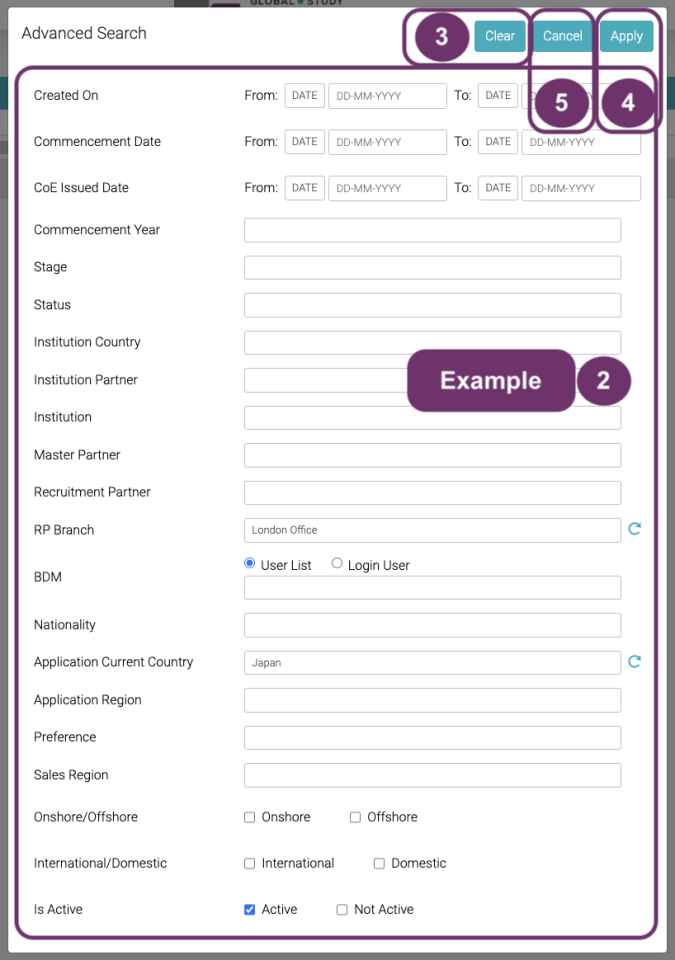 Example: You want to see all active and enrolled applications owned by students who are in Japan at the time of application and were recruited in London Office