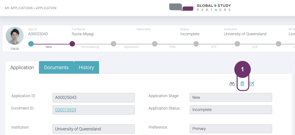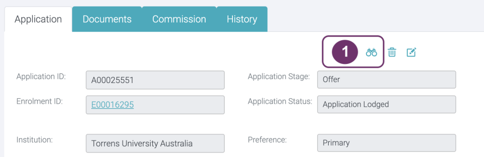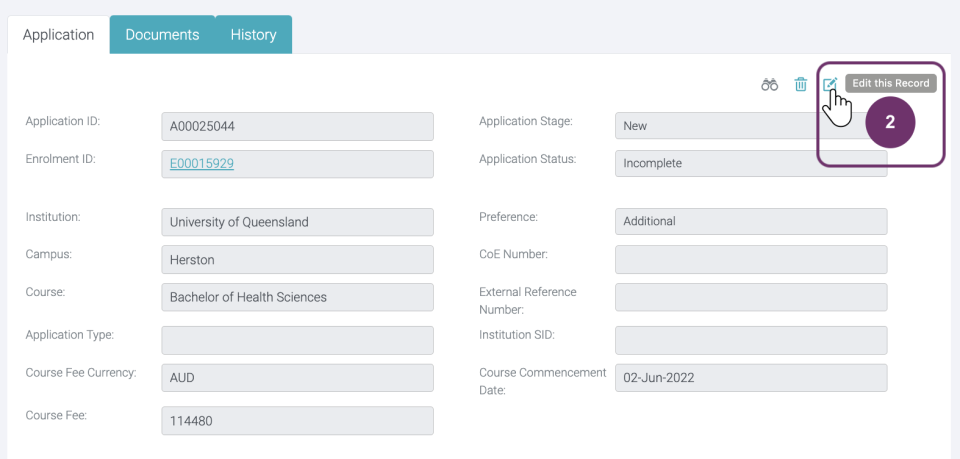 - Enrolment ID – the enrolment to which the application is under. You can click this to navigate to the enrolment record page