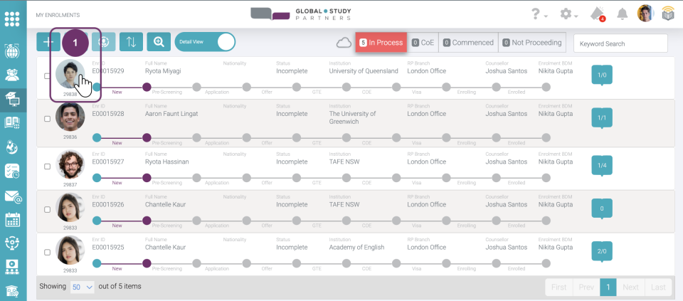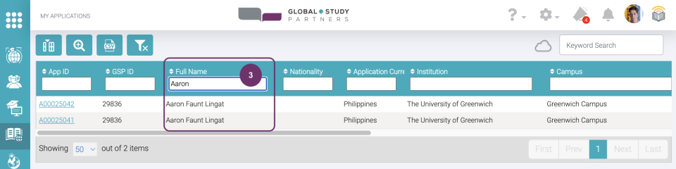 The simultaneous search is helpful especially when you can’t remember all the details of a column/ field. Let’s say you want to find all the applications related to Aaron Faunt Lingat. However, you can only remember ‘Aaron’. You can type ‘Aaron’ under ‘Full Name’ and the list will filter all applications related to students with the name of ‘Aaron’. You can also refine searches by typing details on other columns all of the same time.